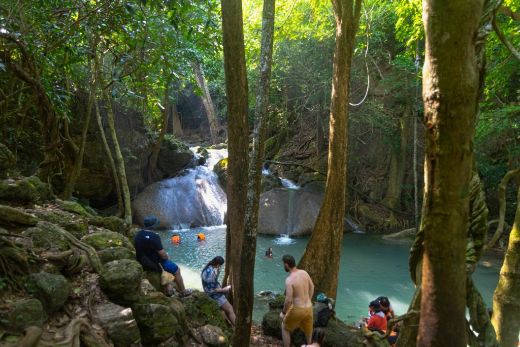 Cerca, y por eso vamos hasta allí, está el Parque Nacional de Erawan, famoso por sus cascadas de siete niveles con pozas turquesas para nadar. Lo de nadar es un decir. El lugar está plagado de turistas locales que no paran de mear en las pozas y hacerse selfies. Además, es obligatorio el uso de un terrible chaleco salvavidas rojo, so pena de ser amonestado por los guardias. Aun así, el lugar merece el esfuerzo de la visita, aunque deja esa reflexión melancólica de que la Tailandia que conocimos hace más de veinticinco años va dejando de existir. El turismo local ha copiado nuestros peores hábitos: la prisa, el selfie, el consumo rápido de lugares. Exportamos nuestra forma de viajar y ahora nos la devuelven. El paraíso, cuando se masifica, deja de serlo. Da igual quién lo invada.