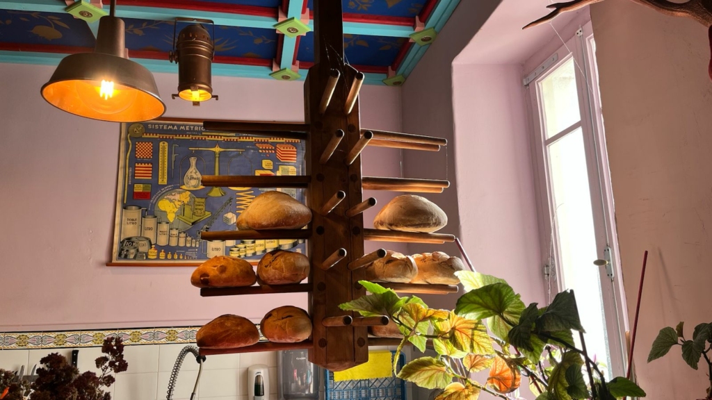 Restrepo es un lugar donde cada rincón cuenta algo. Las hogazas de pan reposan en una especie de percha de madera, una rústica hornacina colgada del aire donde la luz del sol que entra por la ventana las ilumina como si fueran piezas de orfebrería. Pan con aureola. En cualquier otro sitio serían pan; aquí parecen una ofrenda. Estética y armonía.