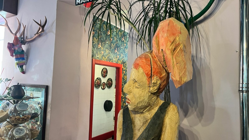 La decoración es ecléctica. Sorprendente y certera. Un secador de pelo de peluquería de los años cincuenta encuentra su sitio con naturalidad al lado de las estanterías de vinos. Nada desentona porque todo desentona, y en esa contradicción reside el acierto. Rubén, que es carpintero y es artista, con el ojo de quien trabaja con las manos, ha conseguido que cada pieza ocupe el único lugar posible, como si el local hubiera crecido alrededor de los objetos y no al revés.