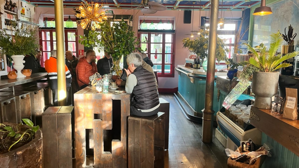 Los paisanos del pueblo entran y salen con naturalidad, adaptados a un local que podrá destacar en la Gran Vía de Madrid. Vienen a tomarse algo antes de volver a casa o de cambiar de taberna, que en Grandas cambiar de taberna es vida social. Se sientan entre moteros con chaquetas de cordura y peregrinos del Primitivo con la misma soltura con la que se sentarían en la cocina de su casa. Restrepo ha conseguido eso que tan pocos locales logran: que el forastero se sienta del pueblo y que el del pueblo se sienta en un sitio especial.